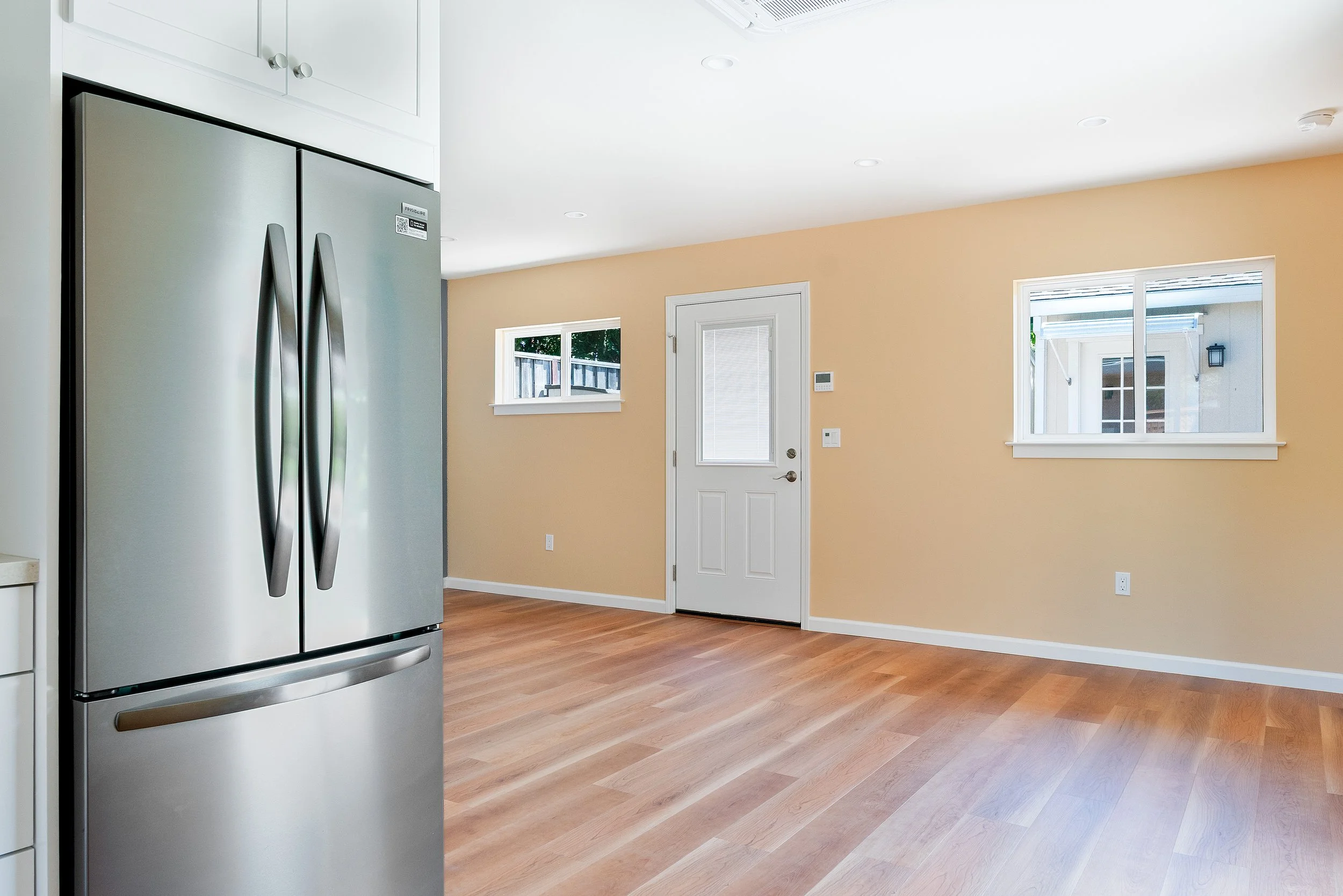 Empty kitchen with light wood flooring, beige walls, a white door with a window, and two windows showing an outdoor view. Part of a stainless steel refrigerator is visible on the left.