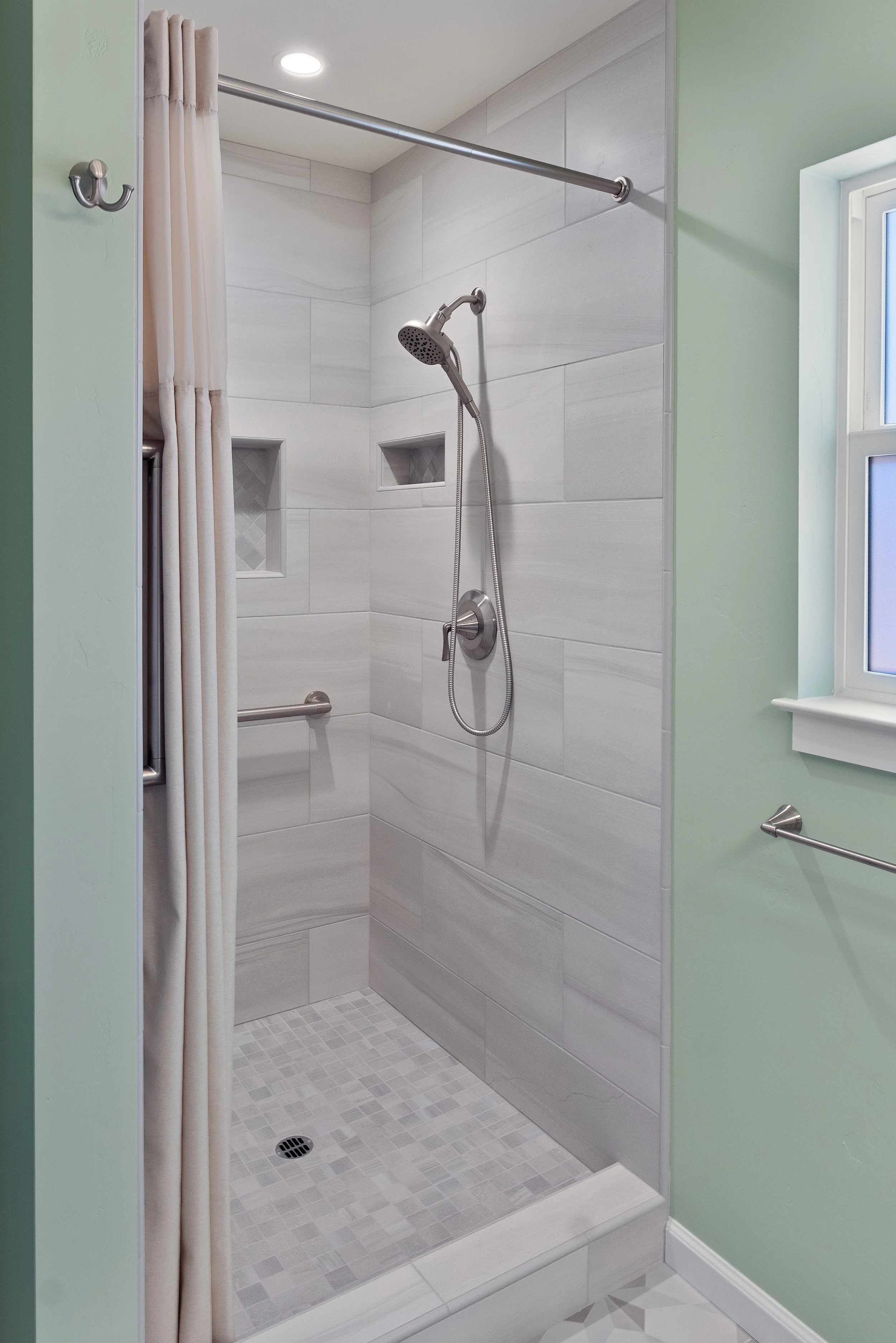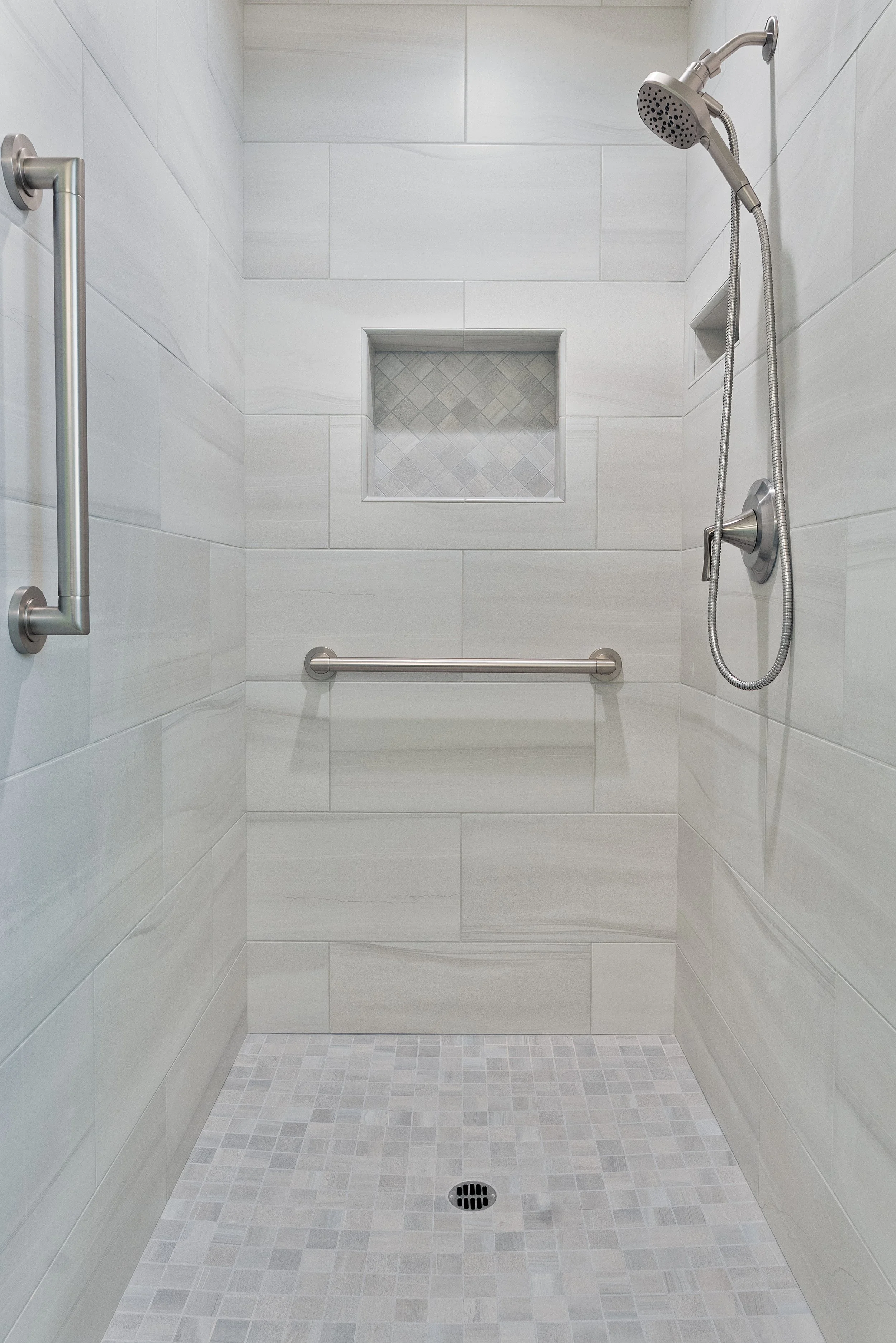 Empty shower with light gray tile walls, a built-in tile niche, a handheld showerhead, and a stainless steel grab bar.
