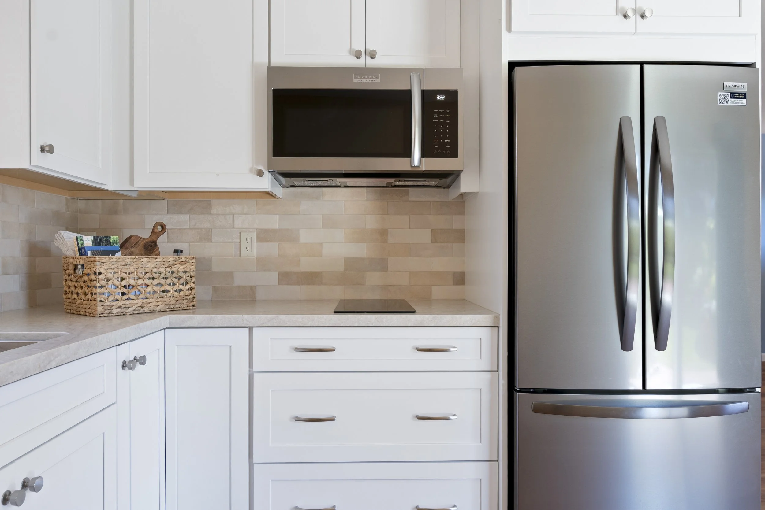 Kitchen with white cabinets, a stainless steel microwave above a stovetop, a wicker basket with papers and a wooden cutting board, and a large stainless steel refrigerator.