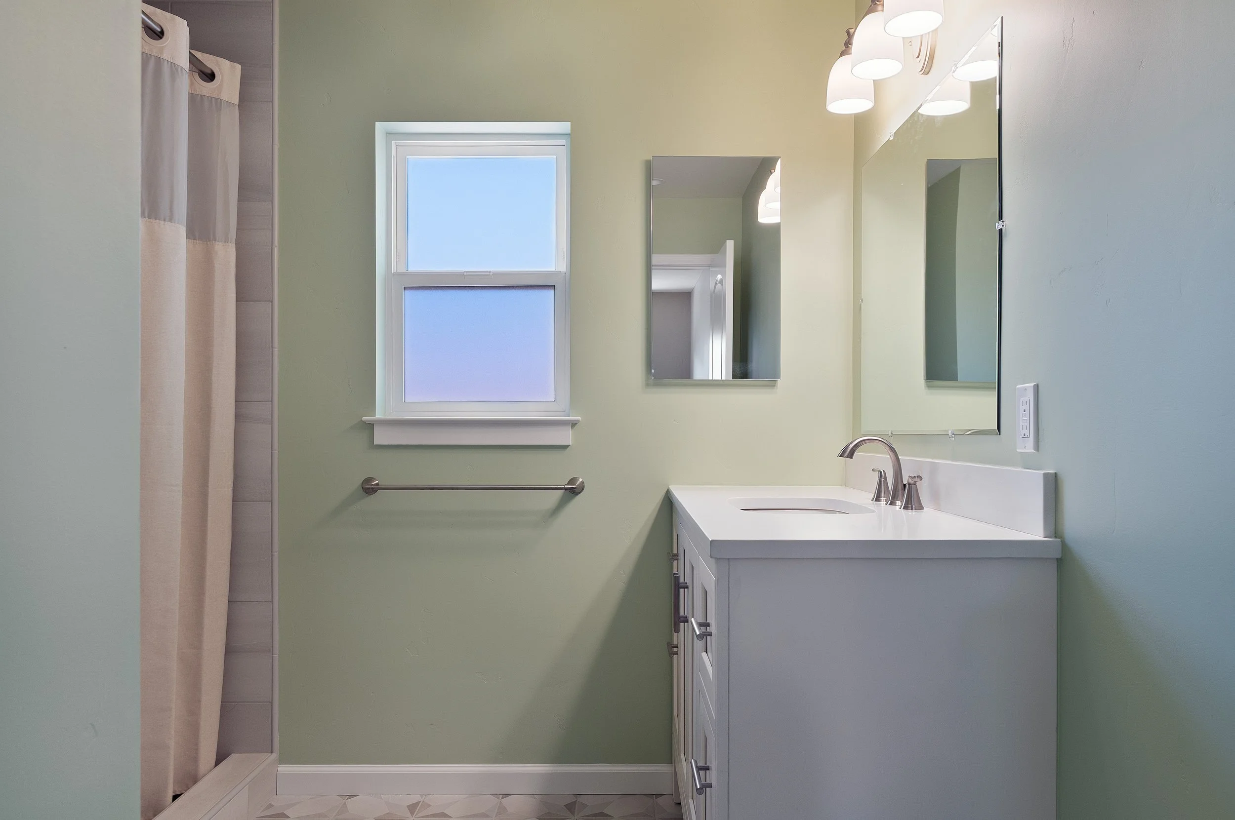 Bathroom with light green walls, a white vanity with a sink, a mirror, a window, and a shower with a curtain.
