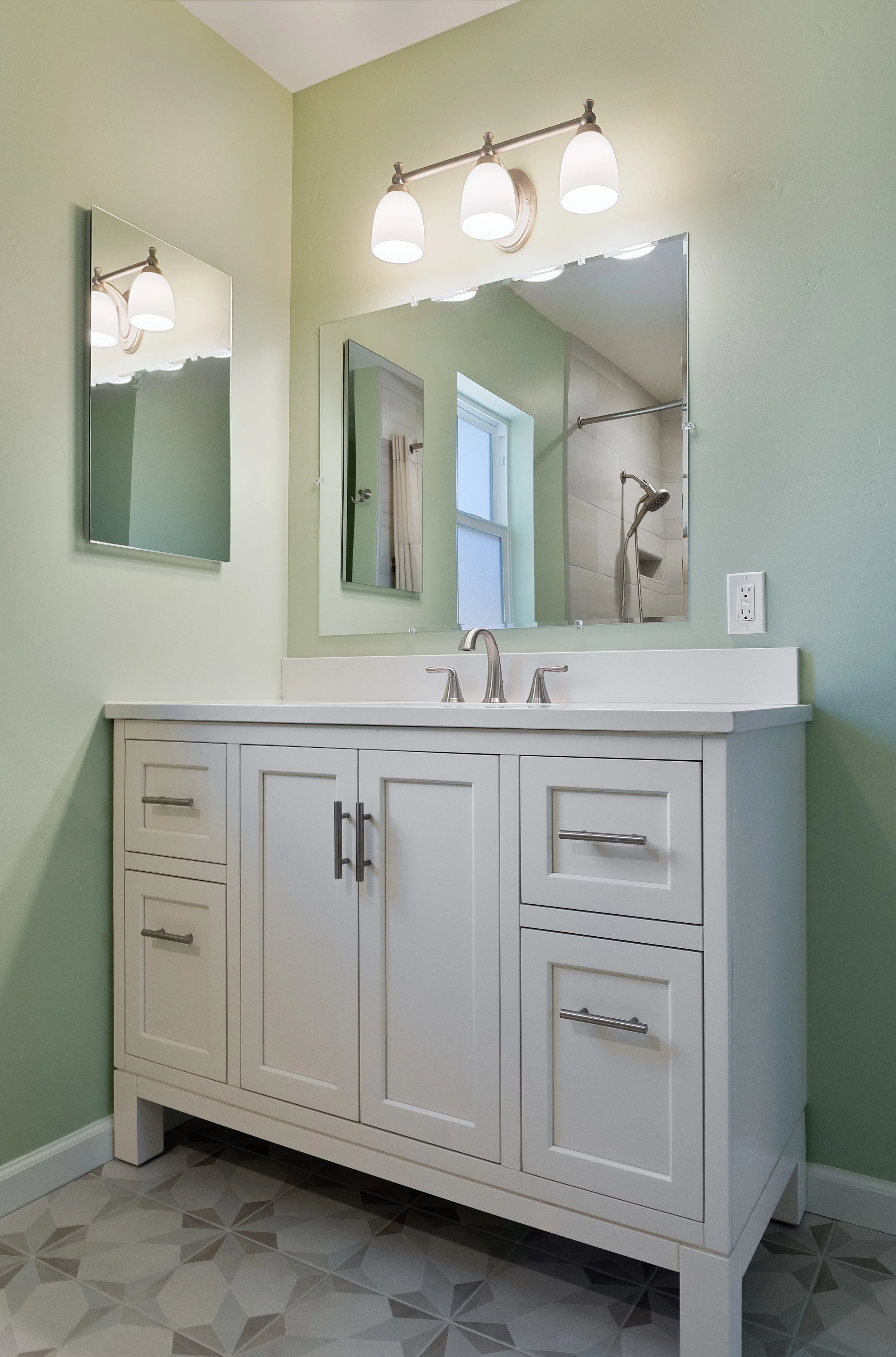 A bathroom vanity with a white cabinet, silver handles, a white countertop, a silver faucet, two mirrors, and a three-light fixture above. A shower with a window and a showerhead is visible in the reflection of the larger mirror. The walls are painte