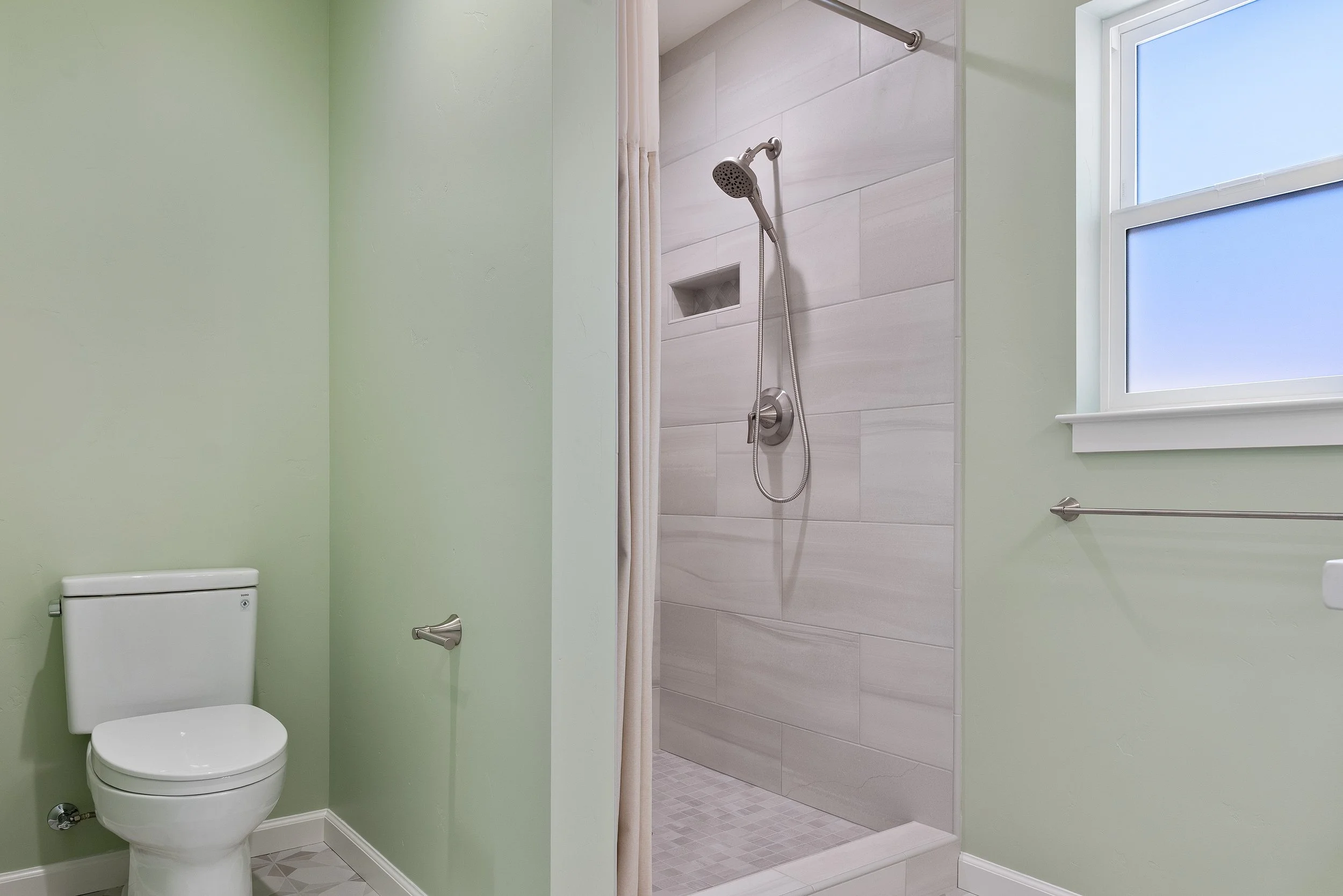 Bathroom with light green walls, a white toilet, and a shower with a rod, showerhead, and a small built-in shelf, next to a window with a white frame.