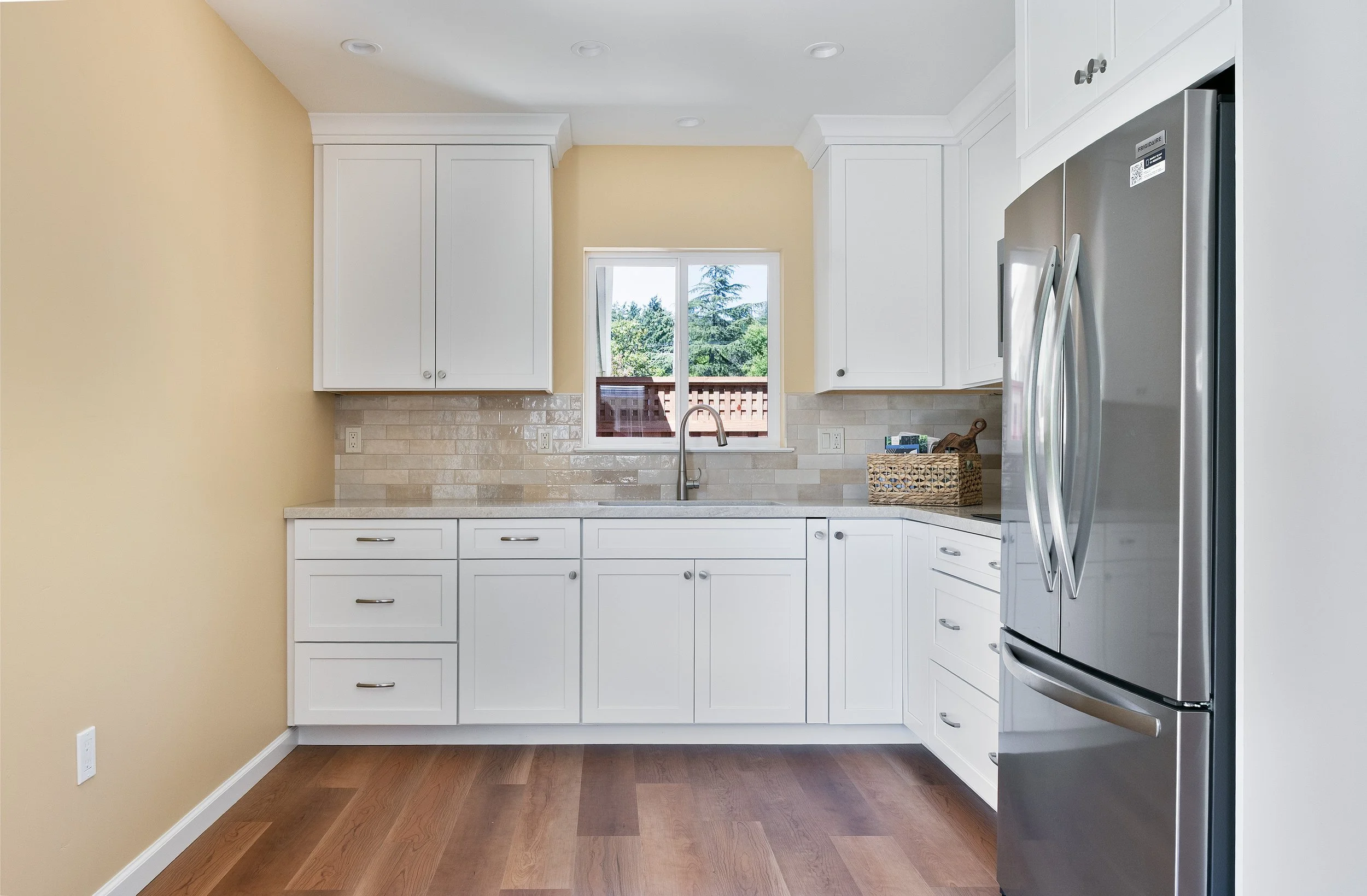 Kitchen with white cabinets, a window above the sink, stainless steel refrigerator, hardwood floor, and beige wall paint.