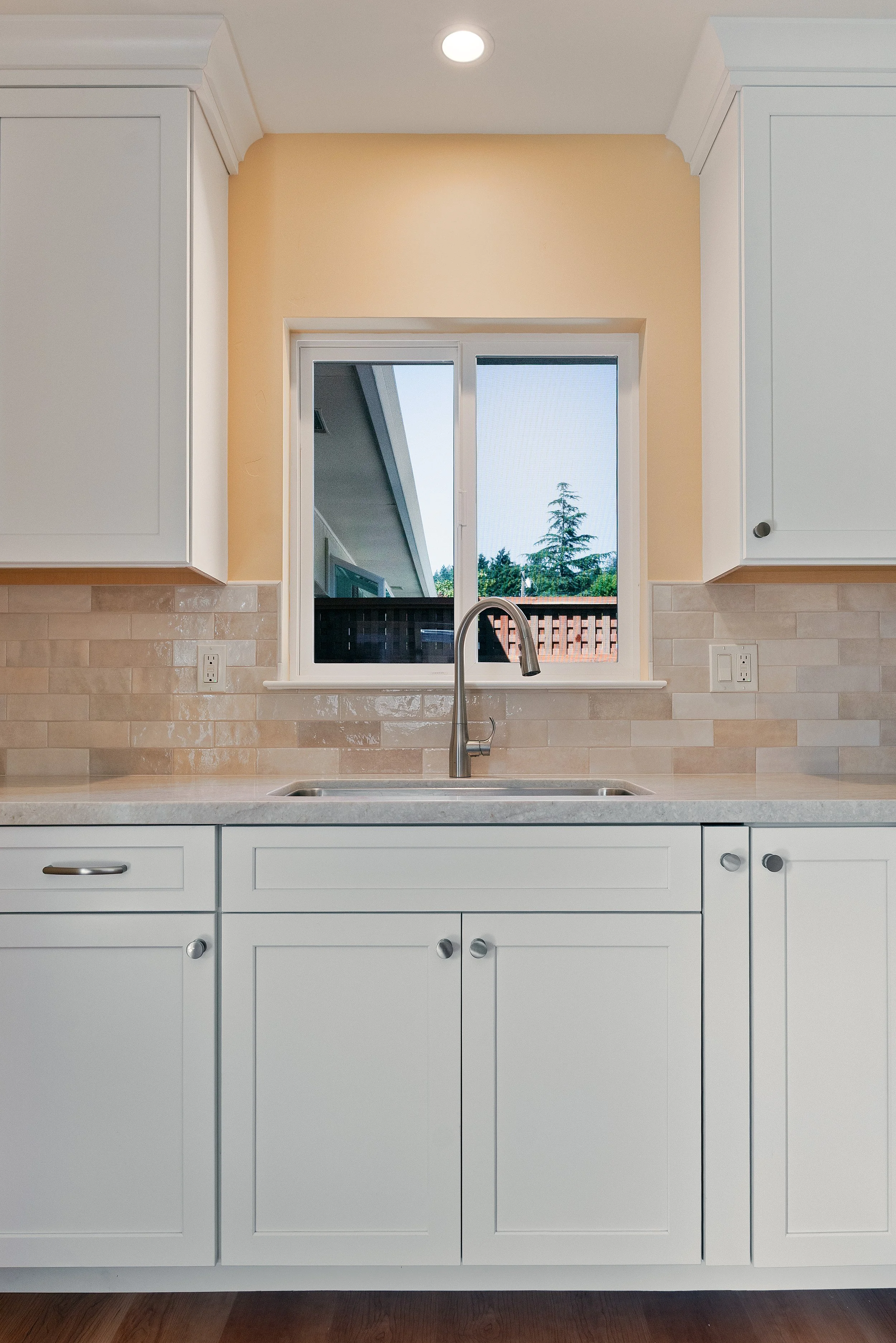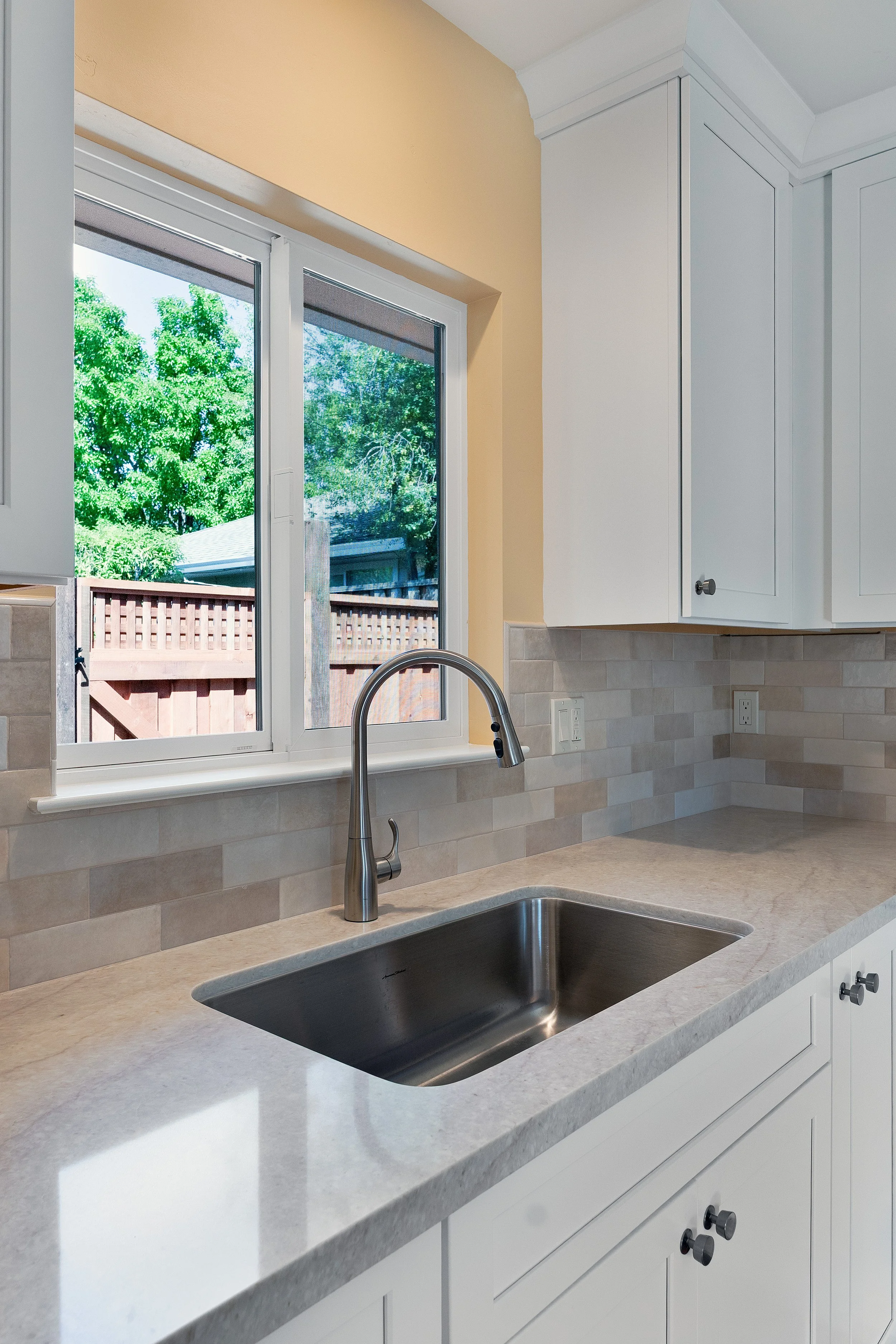 Kitchen sink beneath a window showing trees and a wooden fence outside, white cabinets, beige countertops, beige and gray tile backsplash, and a stainless steel faucet.