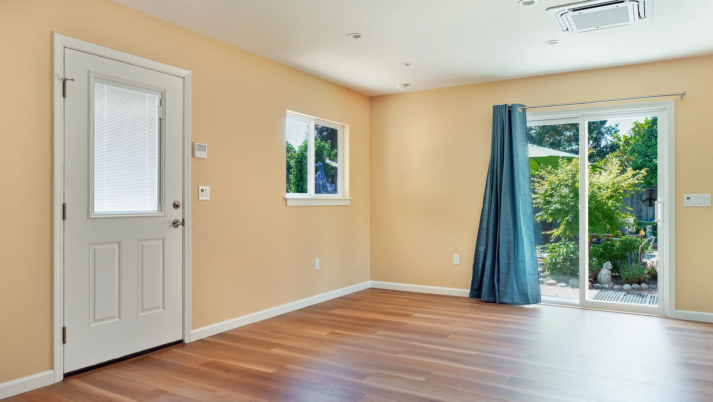 Empty living room with beige walls, hardwood flooring, a white door with a window and blinds, a small window, and a sliding glass door with blue curtains leading to a garden outdoor space.