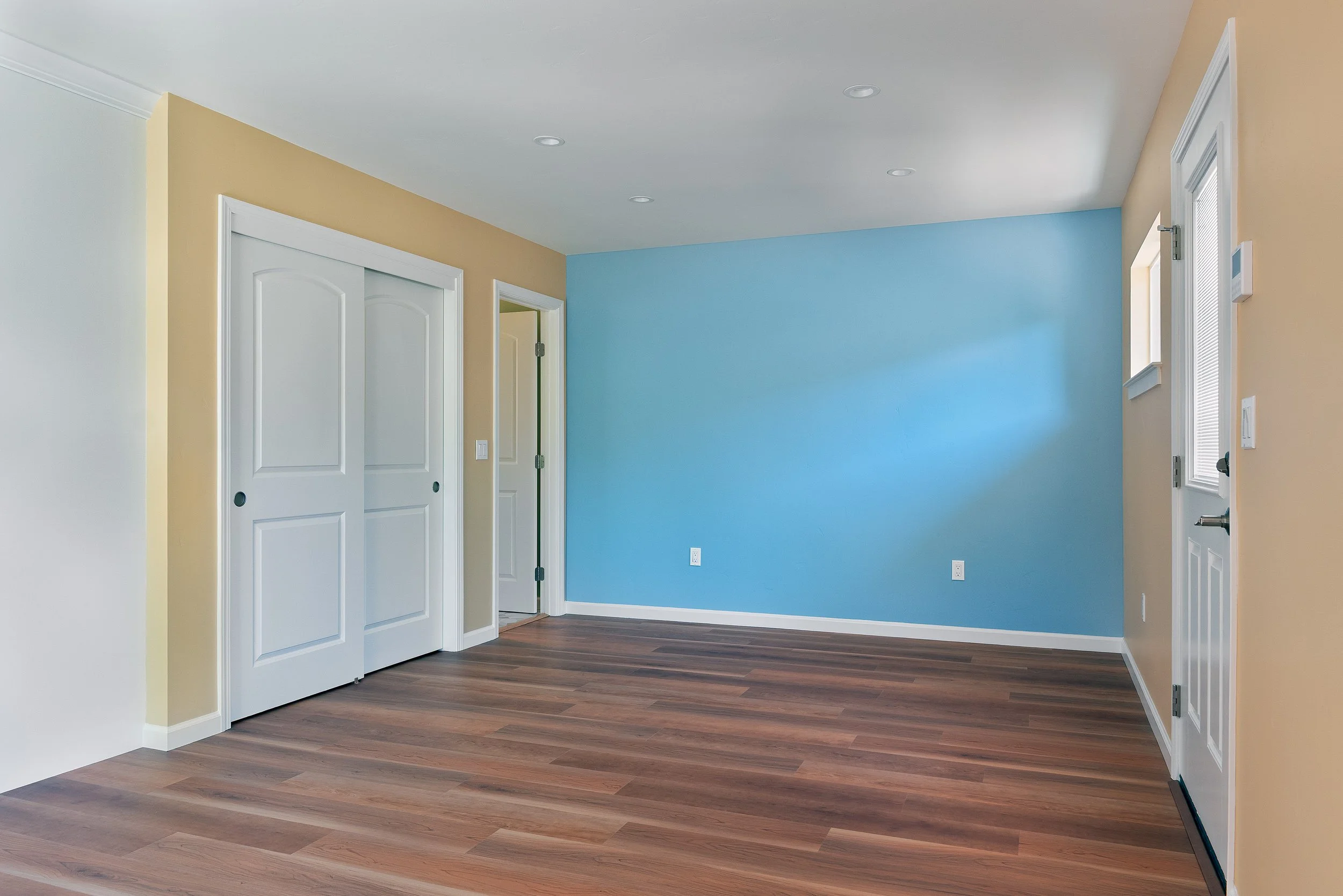 Empty room with yellow and blue walls, hardwood floor, white doors, and small windows.
