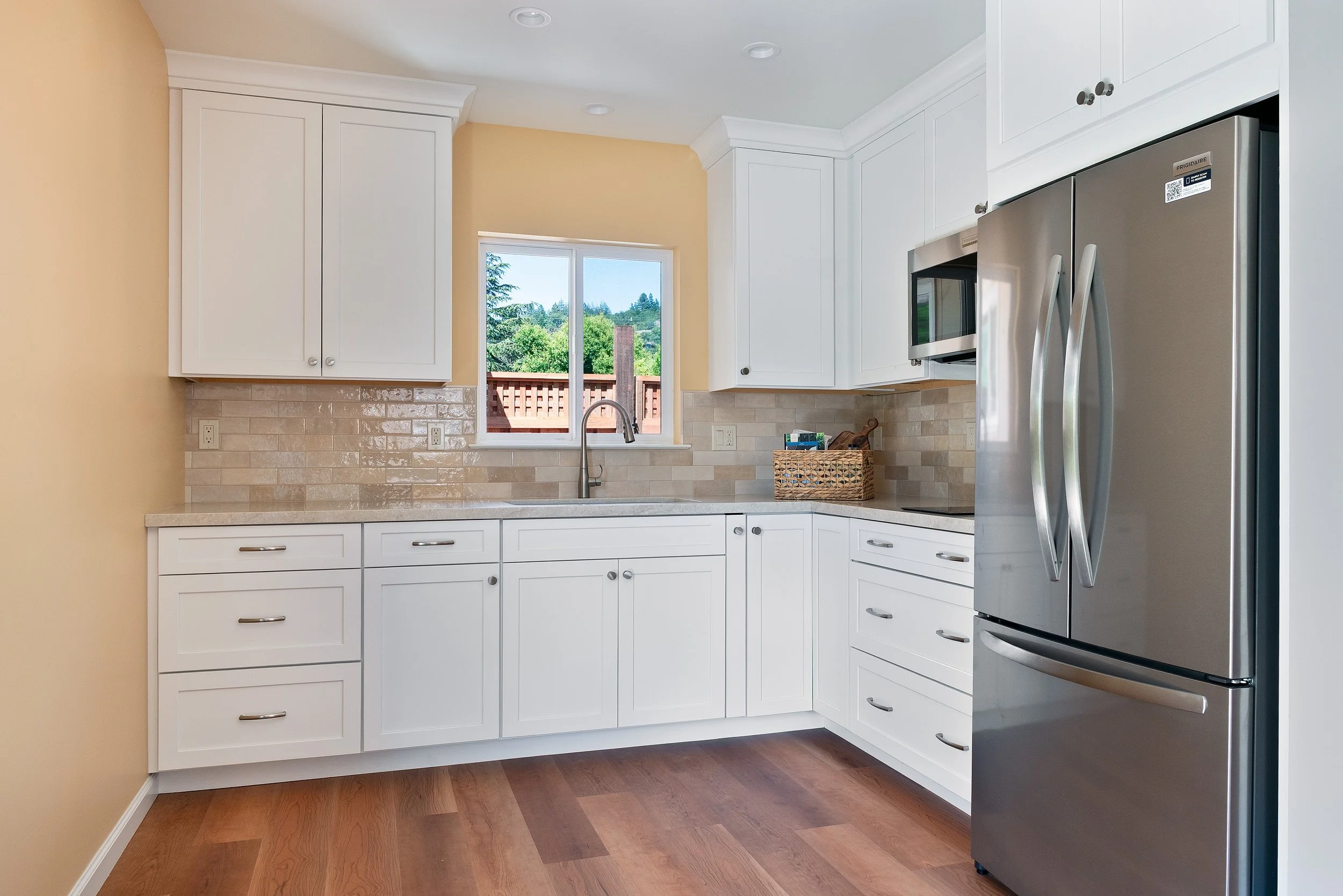 Kitchen with white cabinets, a small window above the sink, stainless steel refrigerator, microwave, and wooden floor.