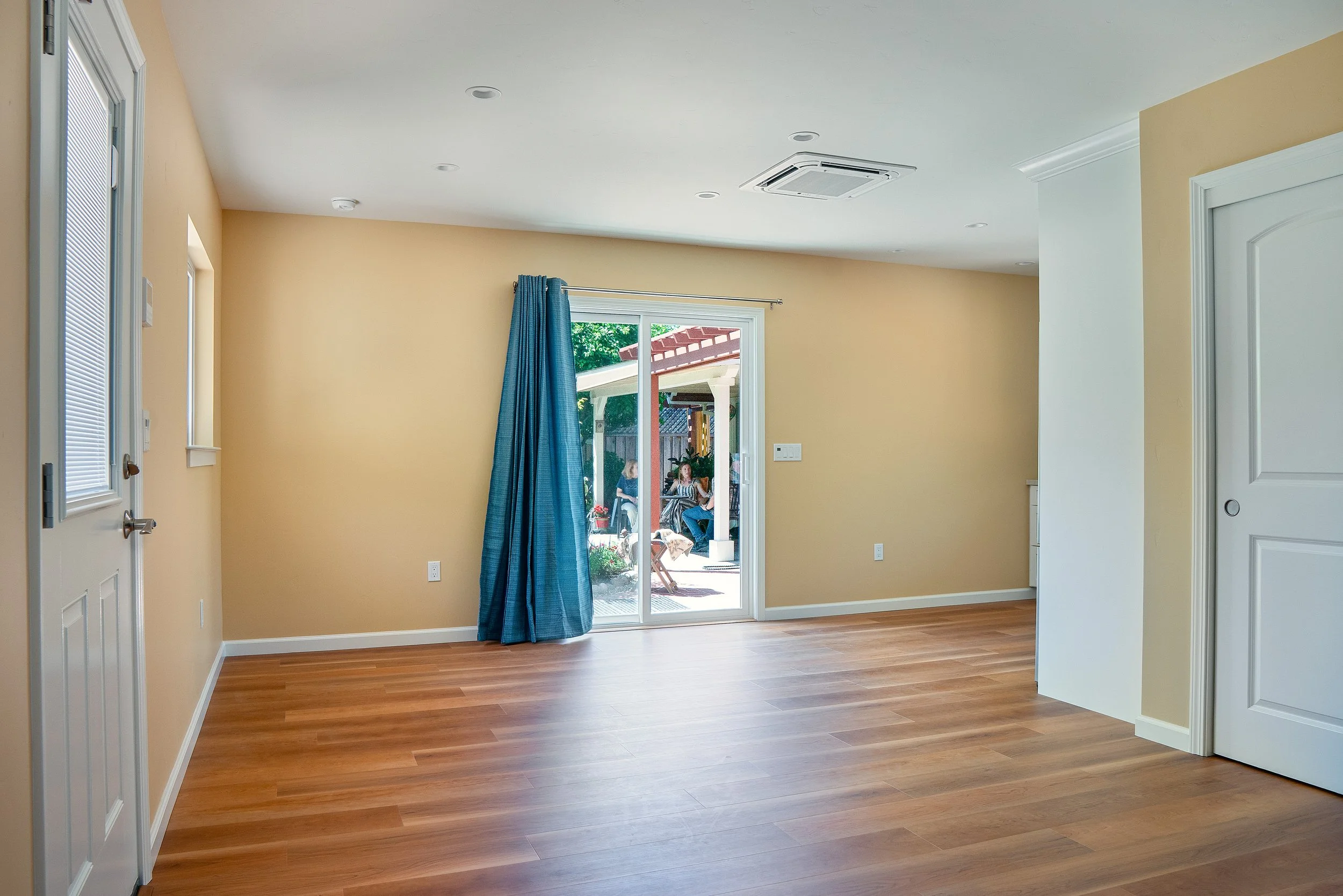 Empty living room with beige walls, hardwood floors, sliding glass door with blue curtains, small outdoor patio with people, and white trim.