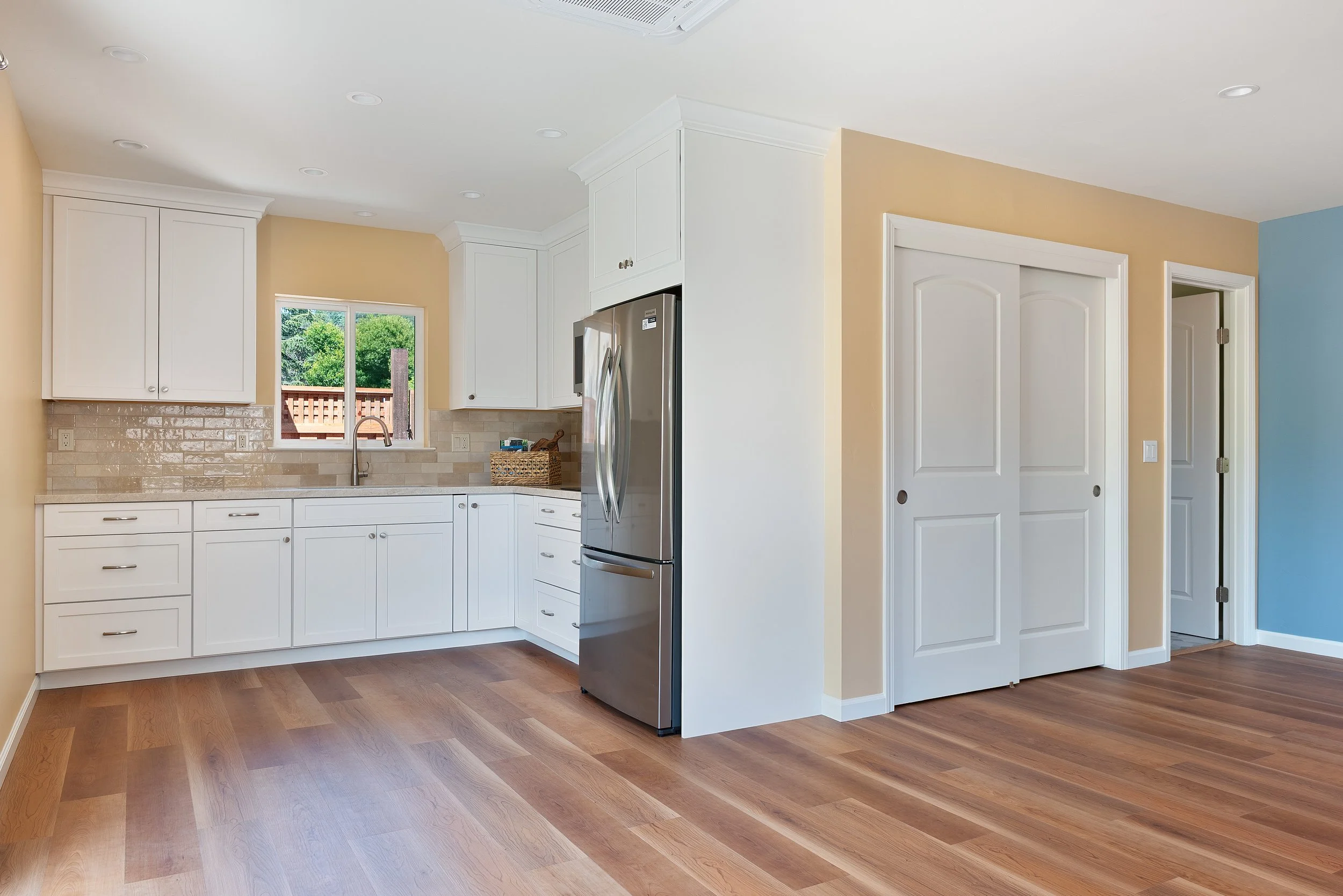 Empty kitchen with white cabinets, a stainless steel refrigerator, a window above the sink, beige wall and trim, blue and beige walls, hardwood flooring, and sliding closet doors.